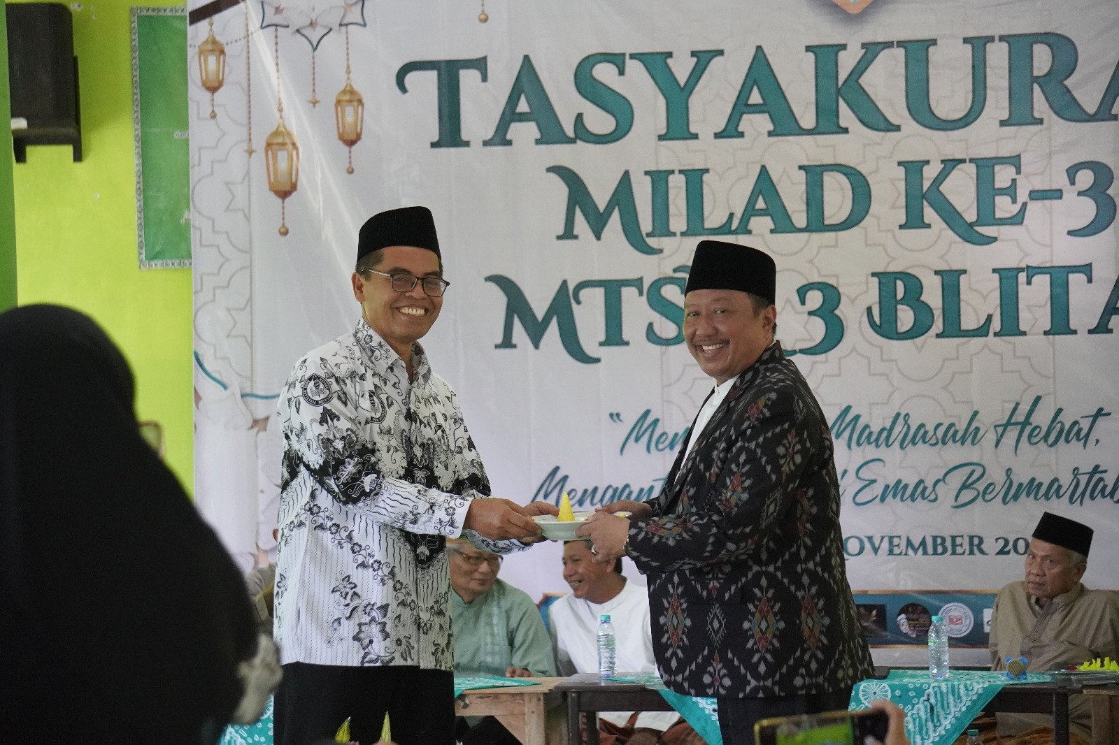 Kepala Kantor Kemenag Kabupaten Blitar, KH. Farmadi Hasyim, S.A.g., M.HI. dalam sambutannya mengucapakan selamat milad ke-30 untuk MTsN 3 Blitar dan selamat hari guru untuk semua guru di MTsN 3 Blitar. Beliau juga menjelaskan tentang 4 orang yang berebut masuk surga yang dikutip dalam kitab Durrotu Nasihin. “Ada 4 golongan yang akan berebut masuk surga yaitu orang yang mengamalkan ilmunya, orang yang gugur dalam peperangan membela agama Allah, haji yang mabrur, dan orang kaya yang dermawan”, tutur beliau dalam sambutannya.